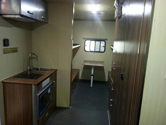 1、整個(gè)車體分成了廚房、休息區(qū)、洗浴區(qū)三個(gè)區(qū)域。