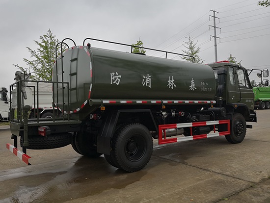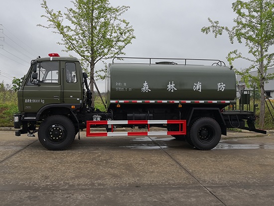 采用東風(fēng)EQ2180GD5DJ型越野汽車底盤,東風(fēng)一排半寬體駕駛室,4×4驅(qū)動,康明斯ISB190 50國五發(fā)動機,六檔變速箱,東風(fēng)商用車橋,前驅(qū)動橋3.8噸,后橋10噸,10.00R20輪胎,軸距4500mm,電動玻璃,方向助力,斷氣剎,ABS。罐體采用優(yōu)質(zhì)碳鋼QB235板材,板材厚度4mm,罐體容積11.1立方,變速箱安裝取力器,大功率水泵可泵進泵出,后置工作平臺帶水炮射程25米,消防栓接口左右各一個,選裝駕駛室頂部安裝長條警燈帶喊話器,全車顏色軍綠,兩側(cè)噴涂白色森林消防字樣。