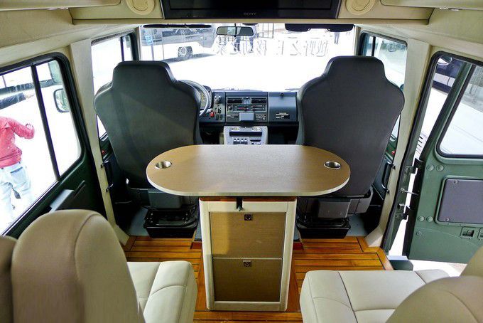 越野房車內(nèi)飾:可以看到,柚木地板外加兩個電動座椅與一個帶儲藏柜的可移動多功能桌構(gòu)成了這輛越野房車的第二排。除此之外,頭頂上方安置有26寸索尼液晶電視和帶衛(wèi)星電視機頂盒的藍光播放器,微波爐烤箱、小型冰箱、電磁爐等常用設(shè)備也是一應(yīng)俱全,當(dāng)然恒溫式的出水系統(tǒng)以及真空馬桶、獨立淋浴也是一樣不少。具備天窗和側(cè)窗的尾箱處安置有兩張舒適的標(biāo)準(zhǔn)床鋪,可以說盡管這輛U5000并非加長特裝版,但所有居住設(shè)備都很齊全。